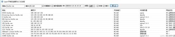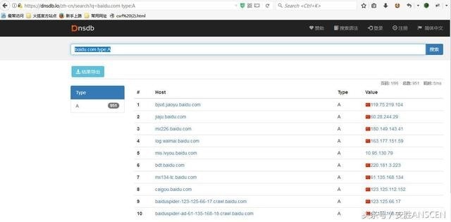 黑客只需输入baidu.com type:A就能收集百度的子域名和ip了。如图: