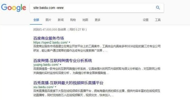 Google site:baidu.com -www就能查看除www外的子域名,如图: