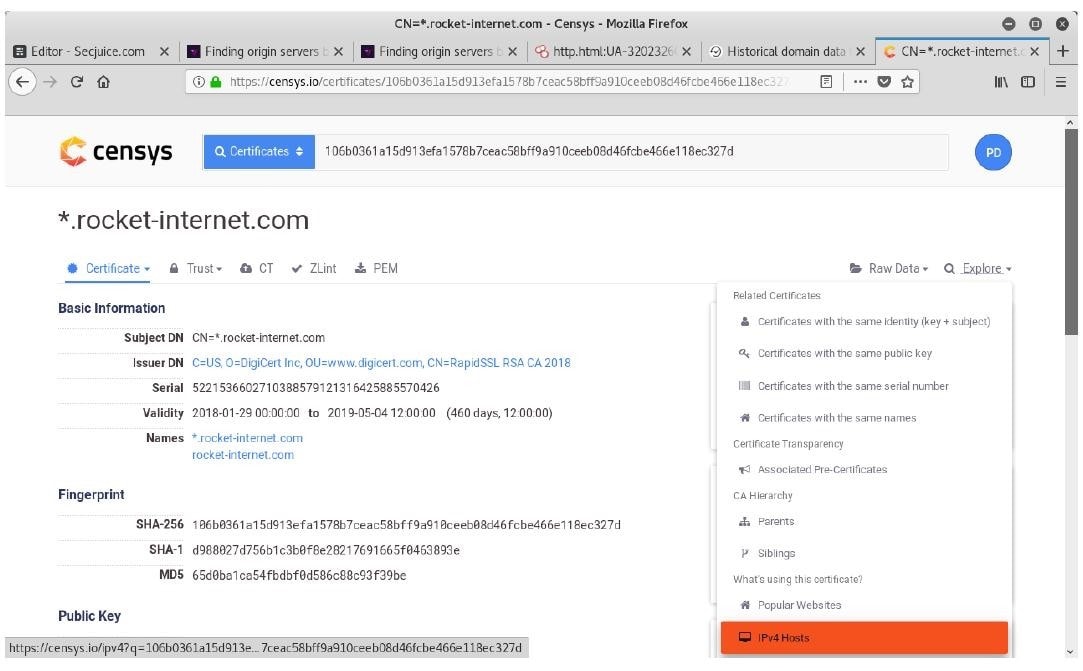 要逐个查看这些搜索结果,攻击者可以通过单击右侧的“Explore”,打开包含多个工具的下拉菜单。What's using this certificate? > IPv4 Hosts
