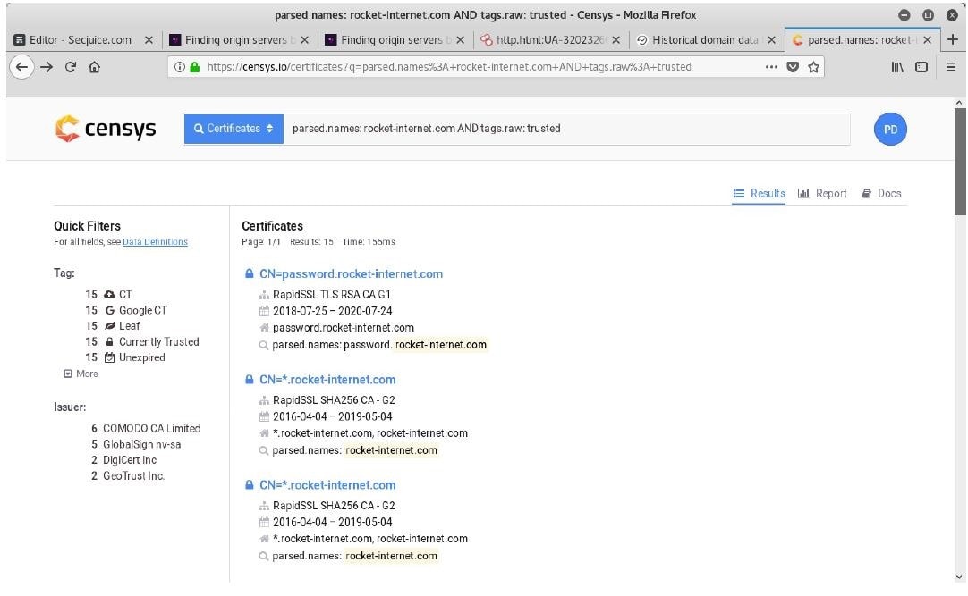 Censys将向你显示符合上述搜索条件的所有标准证书,以上这些证书是在扫描中找到的。