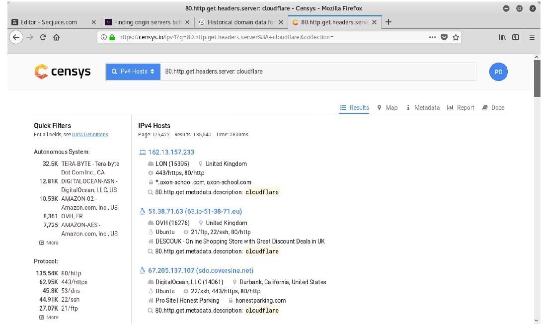 例如,Censys上用于匹配服务器标头的搜索参数是80.http.get.headers.server :,查找由CloudFlare提供服务的网站的参数如下: