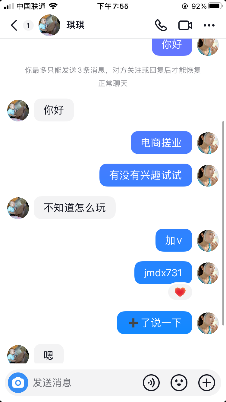 互相关注才可以发图片,单向关注只能发文字,有一个转化率更高的方式是,批量给这些精准粉丝点关注,谁回关你了,你就直接弹抖音的语音通话功能过去,语音聊加粉率会更高。我有一个在抖音上卖抖音赚钱课的朋友,就是专门用这个方式,加粉率特别高,比文字和图片都要高很多很多,你们可以试试。