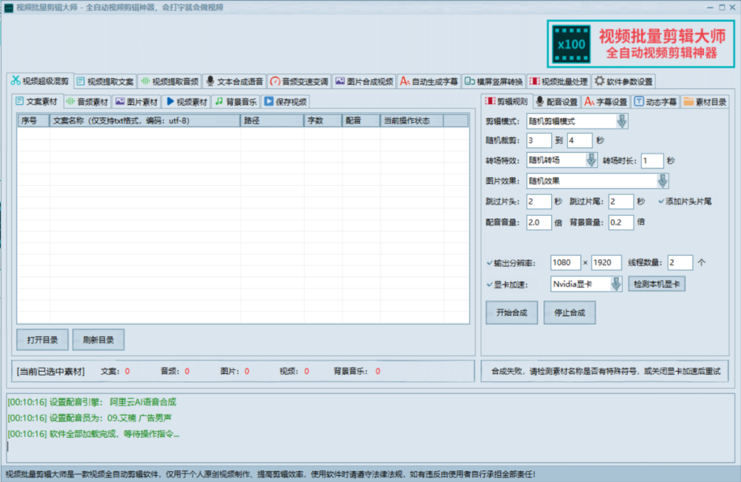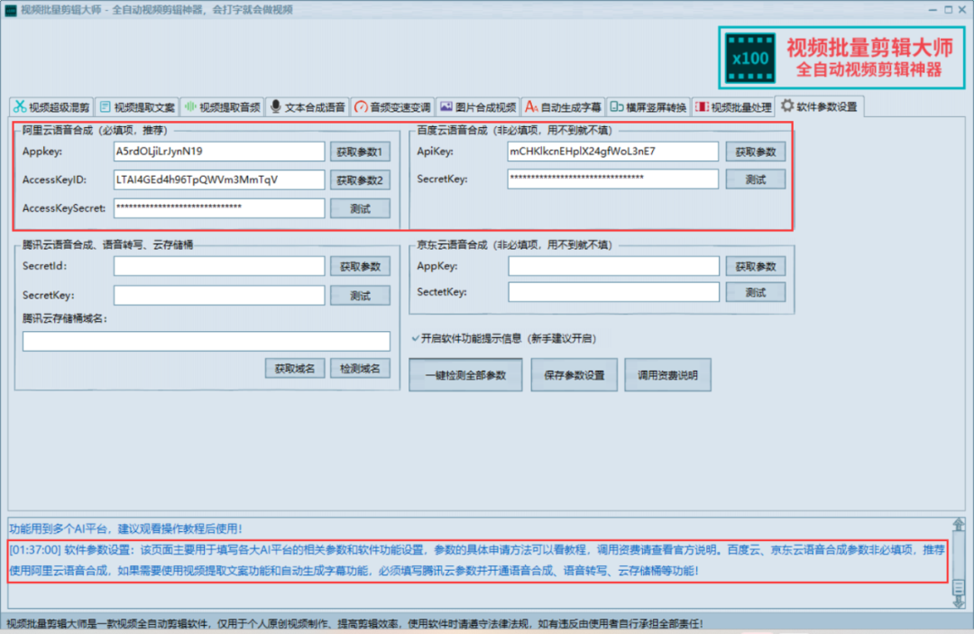 在软件的参数设置界面上,你会发现视频批量剪辑大师已经内置了与阿里云和百度云相关的参数,无需申请付费,可以进行文本合成语音、免费为视频配音等等操作。