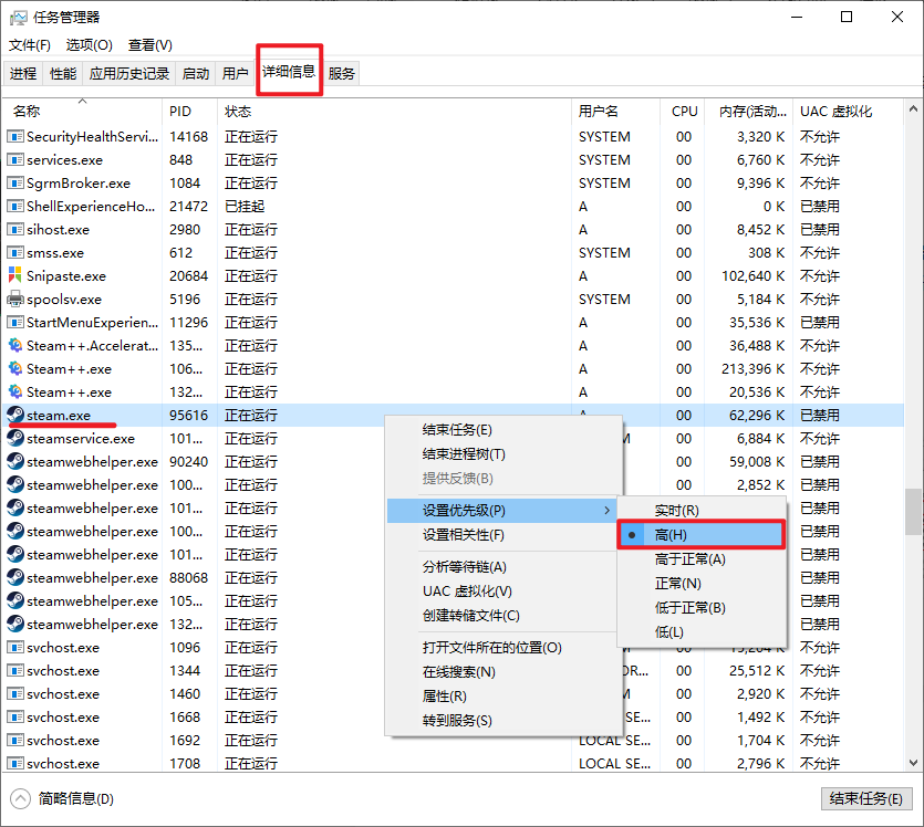 方法2:打开任务管理器,详细信息,找到steam.exe,右键,设置优先级:高