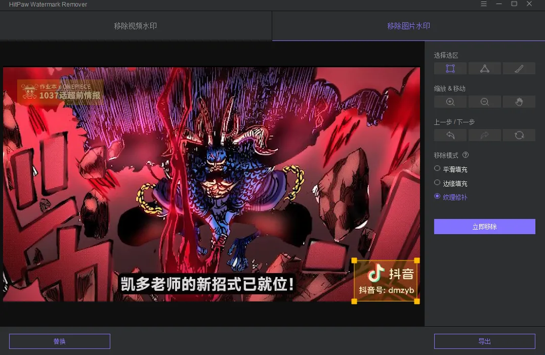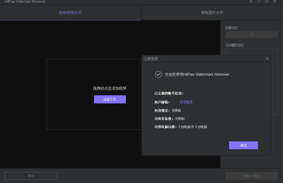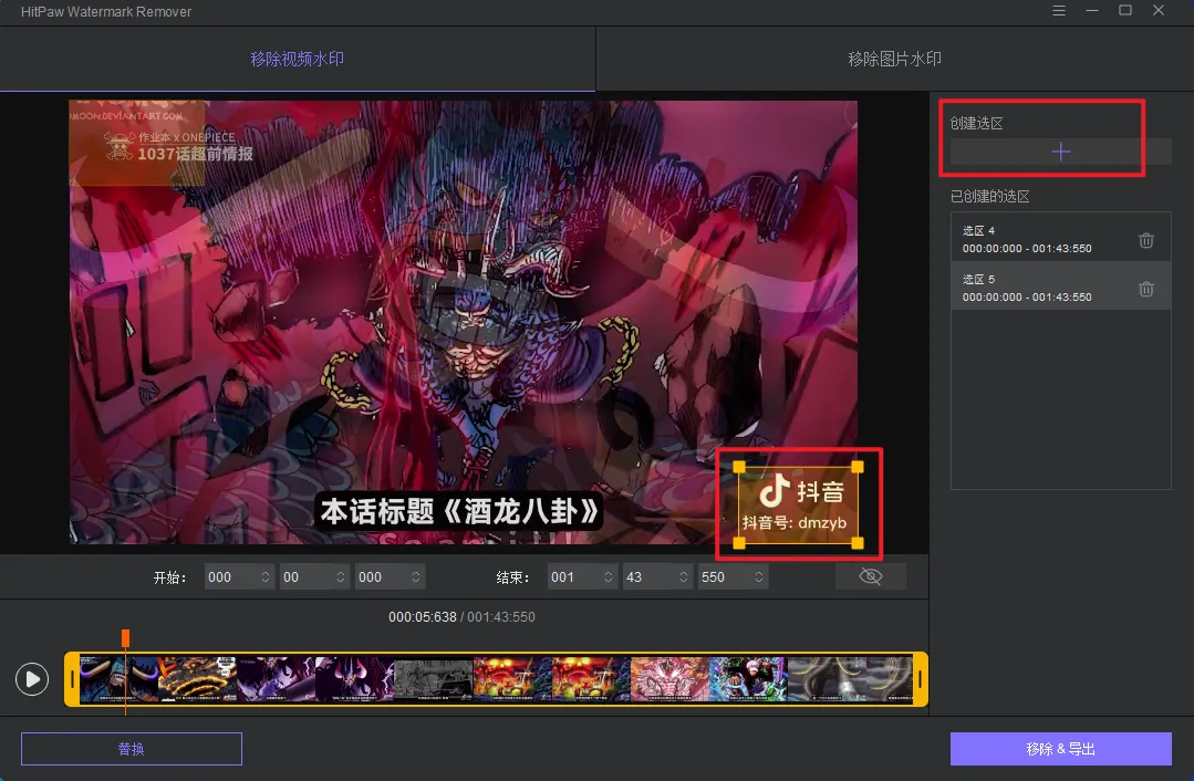 以视频去水印为例:首先把文件拖拽至处理区,接着在右侧点击创建选取,在视频中选取我们需要去除水印的区域,支持多个区域水印去除,最后点击移除或导出即可。